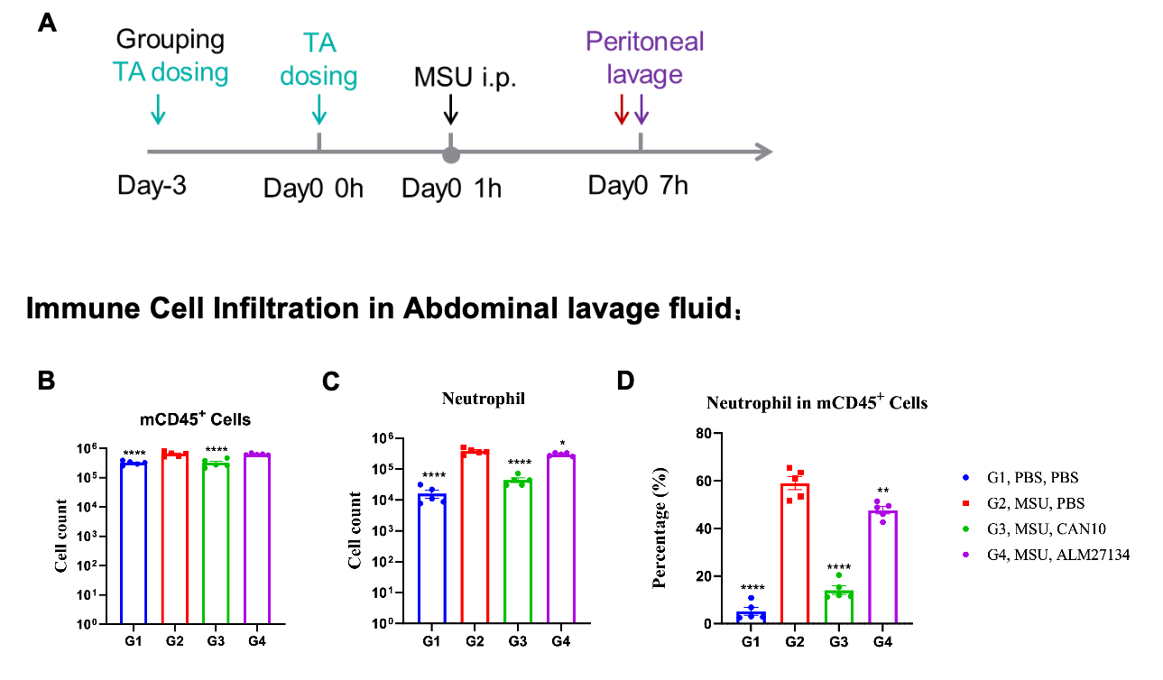 Effects of Anti-IL1RAcP antibody on immune cell infiltration in peritoneal lavage fluid in a MSU-induced peritonitis model using B-hIL1RAcP mice. (A) Modeling paradigm of MSU-induced peritonitis model in B-hIL1RAcP mice. (B) Quantification of mCD45⁺ cells in peritoneal lavage fluid across groups. (C) Total neutrophil counts in peritoneal lavage fluid. (D) Percentage of neutrophils within the mCD45⁺ population, demonstrating that the number of neutrophils was significantly inhibited by CAN10 (in house) and ALM27134 (in house) and almost returned to the level of the control group. Values are expressed as mean ± SEM.