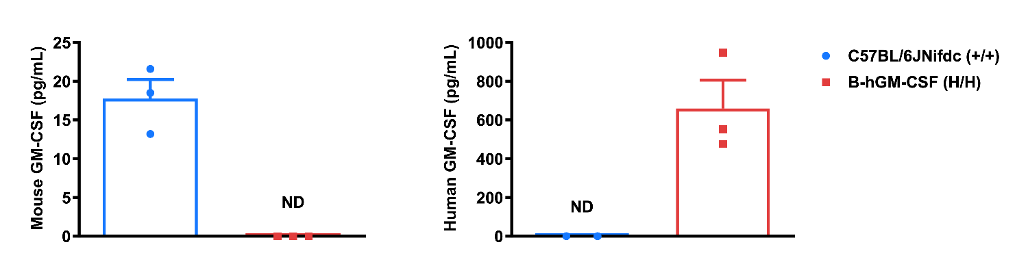 Strain specific GM-CSF expression analysis in wild-type C57BL/6JNifdc mice and homozygous humanized B-hGM-CSF mice by ELISA. Serum was collected from wild-type C57BL/6JNifdc mice (+/+) and homozygous B-hGM-CSF mice (H/H) (male, n=3, 7-week-old) stimulated with LPS (200 μg/mouse) in vivo for 3 hours. Expression level of mouse and human GM-CSF were analyzed by ELISA (anti-Mouse GM-CSF ELISA kit: R&D, MGM00; anti-Human GM-CSF ELISA kit: R&D, DGM00). Mouse GM-CSF was only detectable in wild-type C57BL/6JNifdc mice. Human GM-CSF was exclusively detectable in homozygous B-hGM-CSF mice. Values are expressed as mean ± SEM. ND: not detectable.