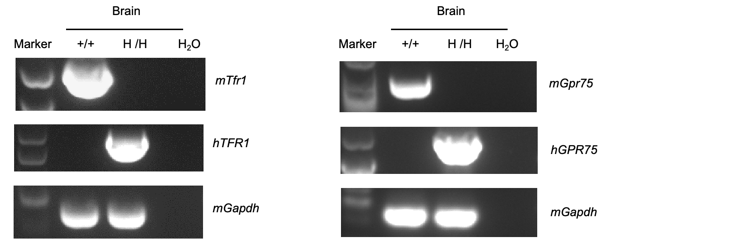 Strain specific analysis of TFR1 and GPR75 mRNA expression in wild-type C57BL/6 mice and homozygous B-hTFR1/hGPR75 plus mice by RT-PCR. Brain RNA were isolated from wild-type C57BL/6 mice (+/+) and homozygous B-hTFR1/hGPR75 plus mice (H/H), then cDNA libraries were synthesized by reverse transcription, followed by PCR with mouse or human TFR1/GPR75 primers. Mouse Tfr1 and Gpr75 mRNA were detectable only in wild-type C57BL/6 mice. Human TFR1 and GPR75 mRNA were detectable only in homozygous B-hTFR1/hGPR75 plus mice but not in wild-type mice.