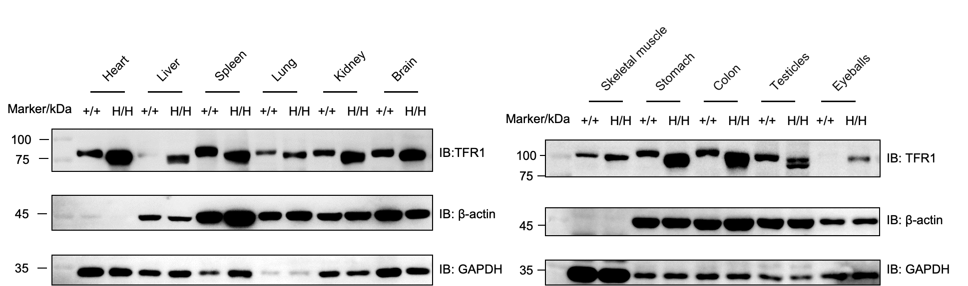 Western blot analysis of TFR1 protein expression in homozygous B-hTFR1/hGPR75 plus mice. Various tissue lysates were collected from wild-type C57BL/6JNifdc mice (+/+) and homozygous B-hTFR1/hGPR75 plus mice (H/H), and then analyzed by western blot with non-species-specific anti-TFR1 antibody(Abcam, ab214039). 40 μg total proteins were loaded for western blotting analysis. TFR1 was detected in the heart, liver, spleen, lung, kidney, brain, skeletal muscle, stomach, colon, testicles, and eyeballs of wild-type and B-hTFR1/hGPR75 plus mice.